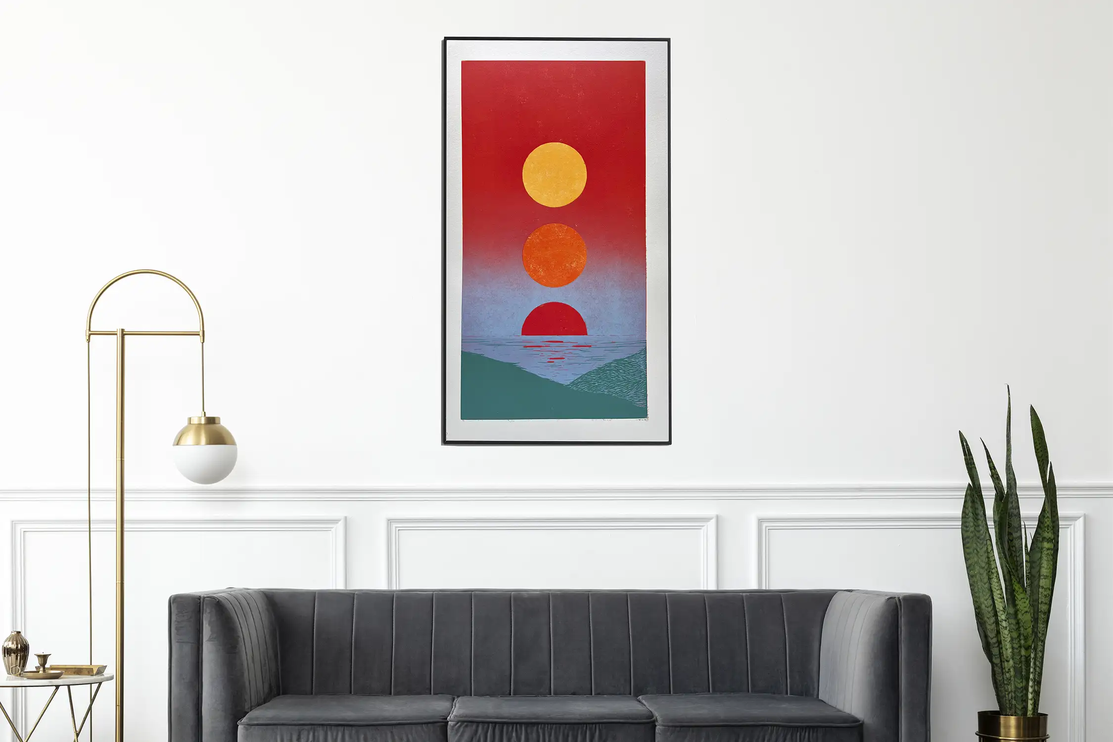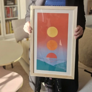 Grafika oprawiona w minimalistyczną drewnianą ramę ze szkłem