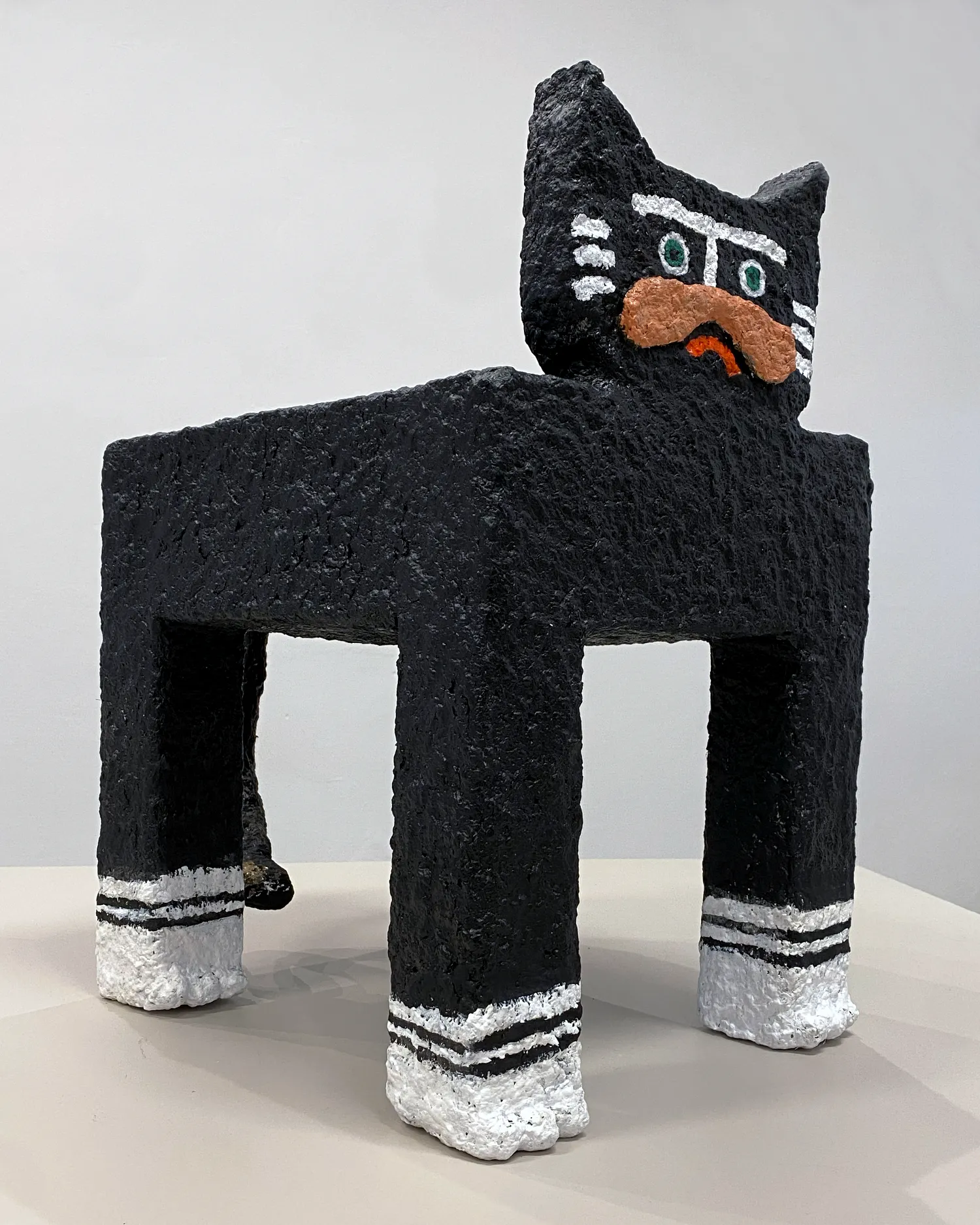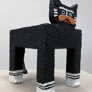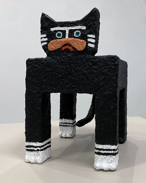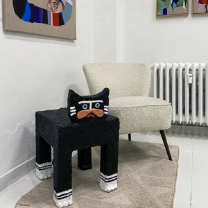Kot z serii Rzeźby Towarzysze to papier-mâché’owy totem domowy – strażnik codzienności, który działa na własnych zasadach. Kot jest dziś jednym z najbardziej popkulturowych zwierząt: bohaterem memów, i wszechobecnych „śmiesznych filmików”. Domowy, oswojony, a jednocześnie zawsze trochę osobny. Na złość kotu, rzeźba ta może też pełnić funkcję stolika-pomocnika.
