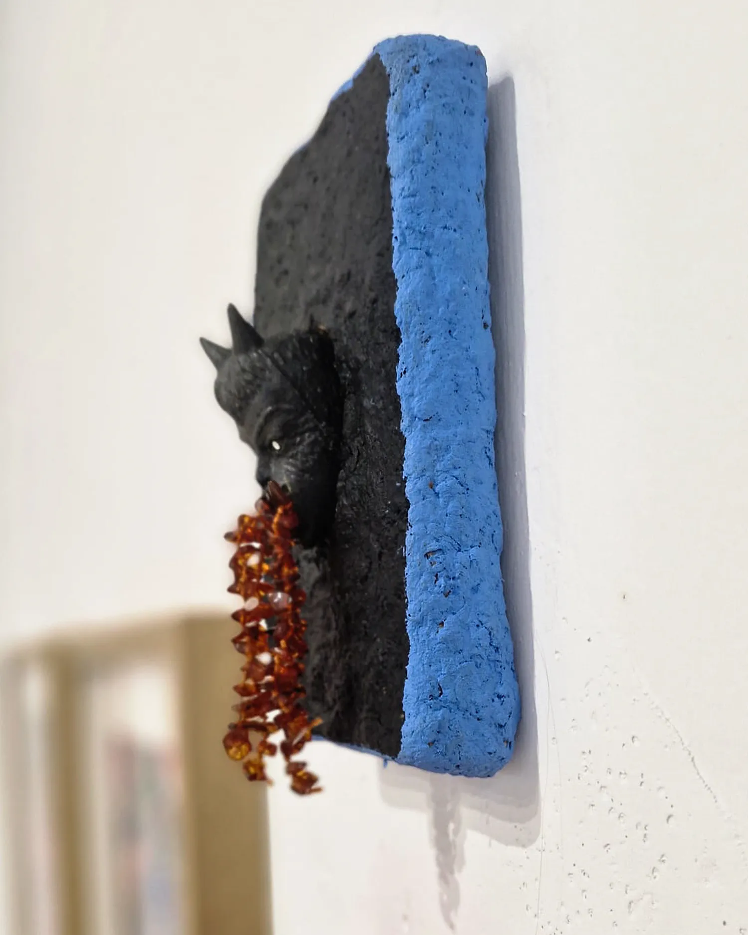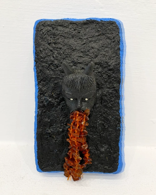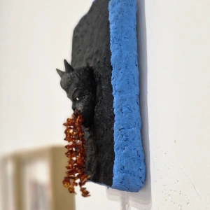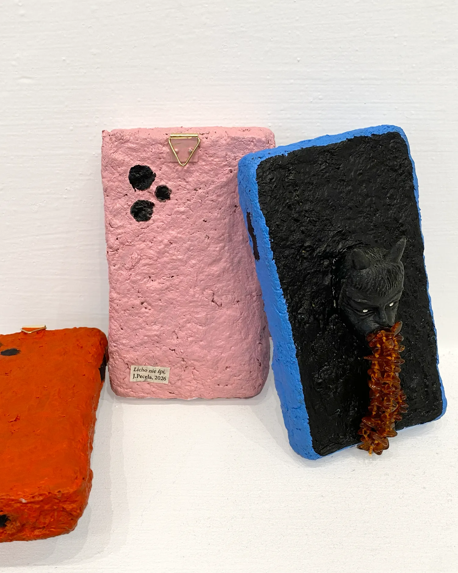 Licho nie śpi to seria rzeźb z papier-mâché w formie smartfonów – współczesnych talizmanów codzienności. Z każdego ekranu wyłania się diabełek: gumowy chochlik popkultury, który wymiotuje tęczą, brokatem, czerwonym jęzorem, fałszywym bursztynem, udawanym złotem i podrabianymi kamieniami. Jak w ludowych figurach chroniących dom przed złem, tak tu zło ma twarz śmieszną i straszną zarazem. Telefon staje się kapliczką, a ekran – bramą, przez którą wylewa się kolorowy nadmiar: obietnice, błysk, tani cud.