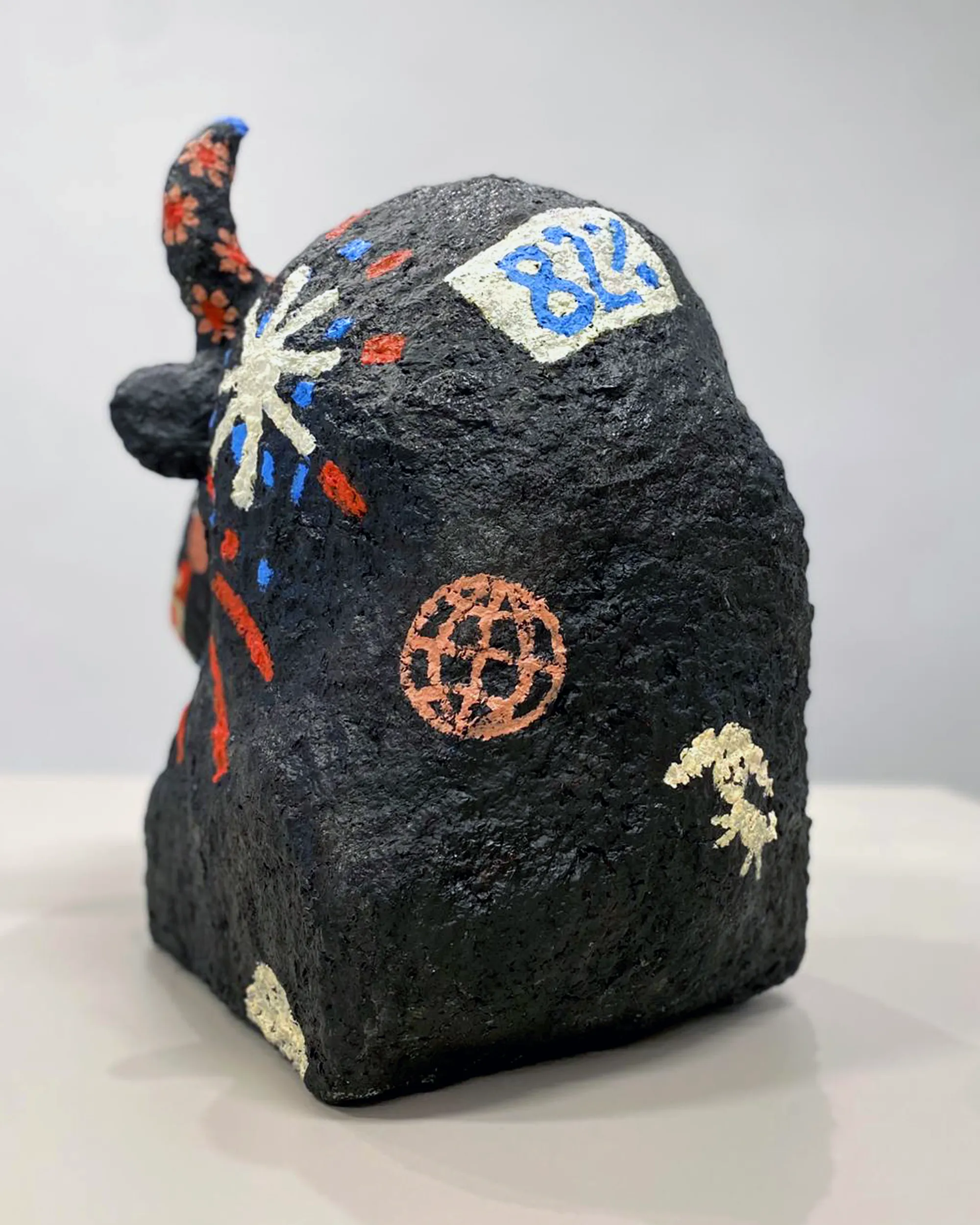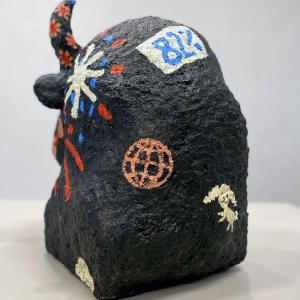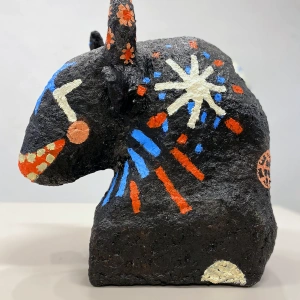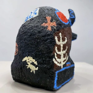 Pan Turoń to rzeźba z papier-mâché z serii Rzeźby Towarzysze, inspirowana ludową tradycją kolędniczą – figurą dziką, hałaśliwą, trochę straszną, ale niosącą obietnicę szczęścia i urodzaju. Jak w dawnych obrzędach, Turoń nie tylko straszy, lecz przede wszystkim zaklina dobrobyt. Na jego ciele pojawiają się znaki współczesnego „dostatku”: drzewo, słońce, ptak, piesek, masło, grzyby, kula ziemska – symbole połączenia ze światem, wspólnoty, obfitości i bezpieczeństwa. To totem na nowe czasy: ludowy demon i strażnik codzienności, który zamiast pól i plonów chroni dziś relacje, uważność i poczucie bycia razem.