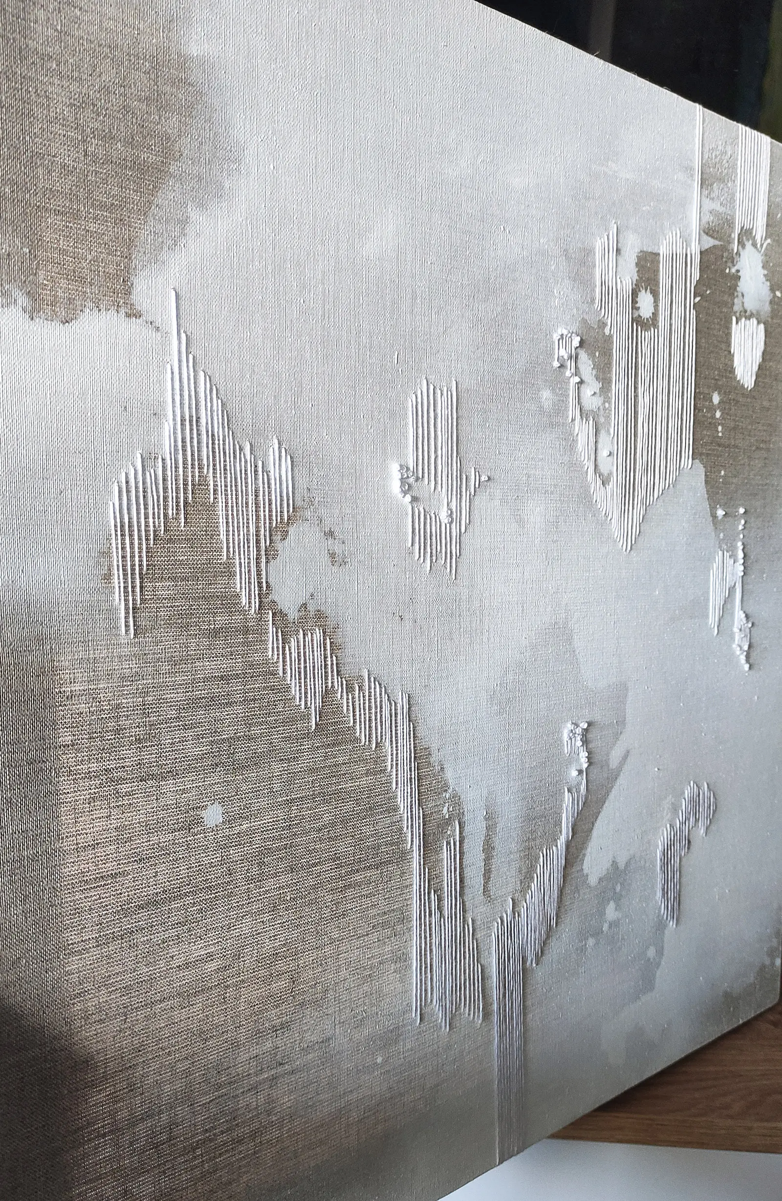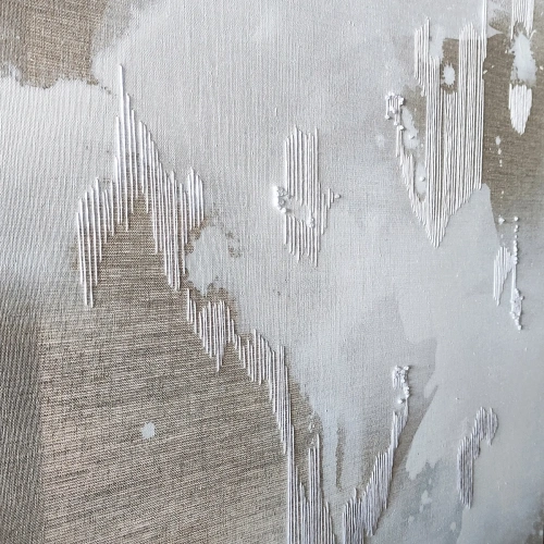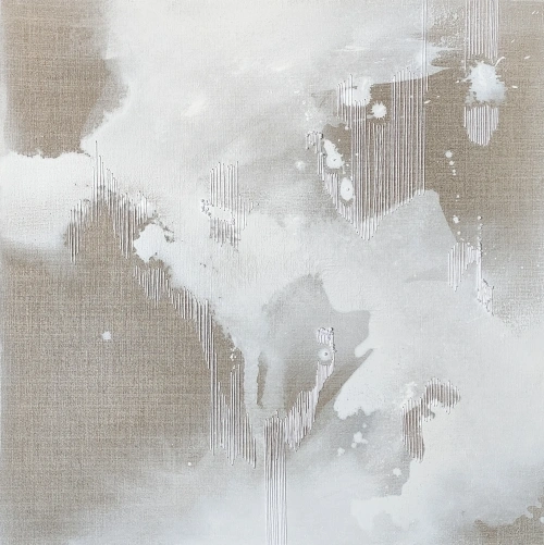 Pełna jasności i delikatności praca wykonana na surowym lnie w połączeniu z techniką haftu. Obraz pozwala odbiorcy nabrać oddechu, nie przytłacza mnogością kolorów, jest minimalistycznym poszukiwaniem rytmów i realnie daje nienachalne ukojenie dla oczu. Pracę "Ulotnie I" dopełnia nieco bliźniaczy obraz zatytułowany