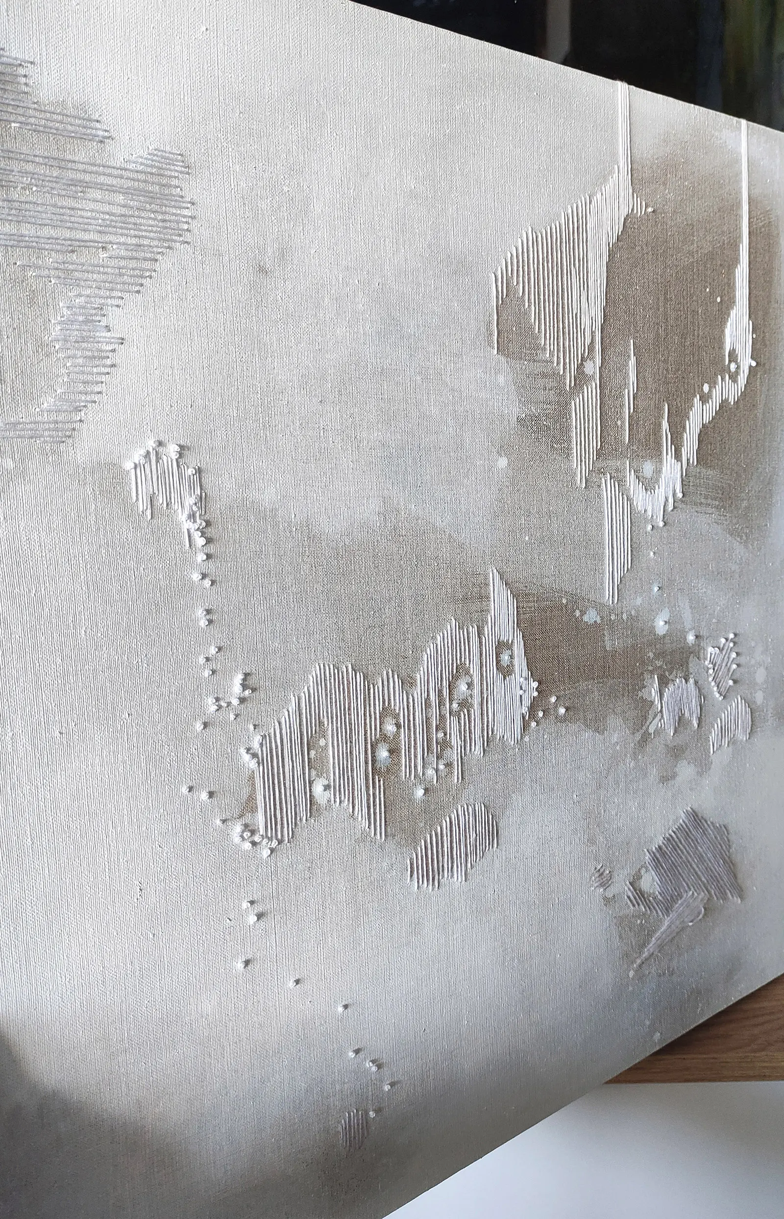 Obraz nawiązujący do pracy "Ulotnie I", który w tożsamy jak on sposób może koić odbiorcę swoją abstrakcyjną i nieco geometryczną kompozycją. Poszukiwanie rytmów i punktów wzajemnych odniesień kreuje bardziej ułożoną przestrzeń na swobodnie płynnej warstwie białej farby. Surowość lnu i biel nici, utrzymuje całość pracy w minimalistycznym charakterze.