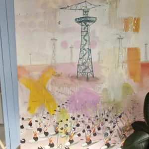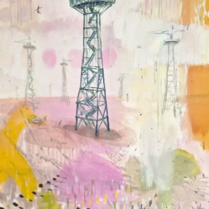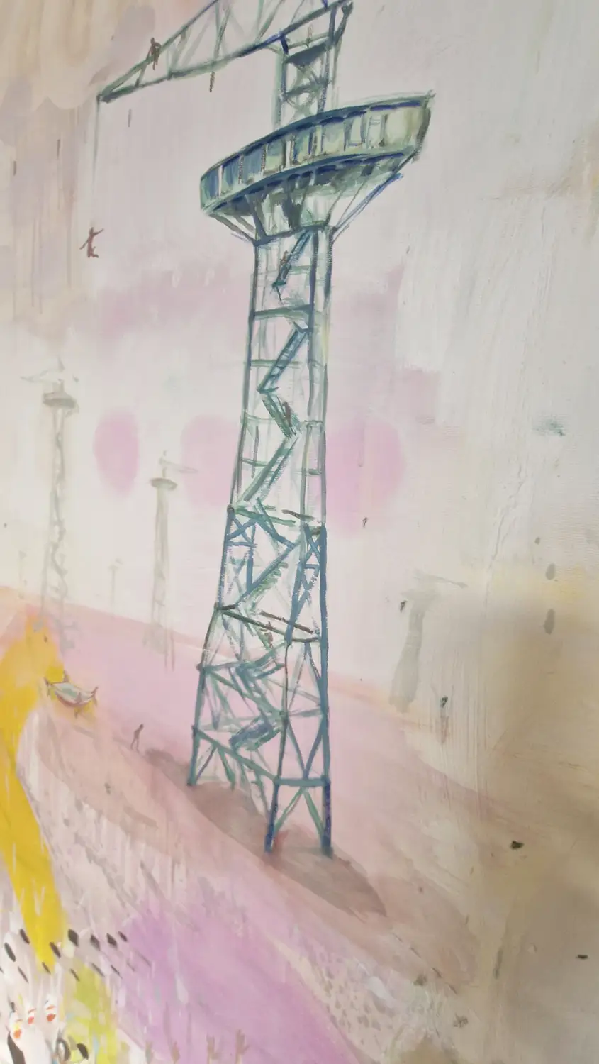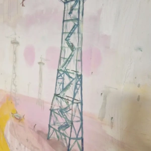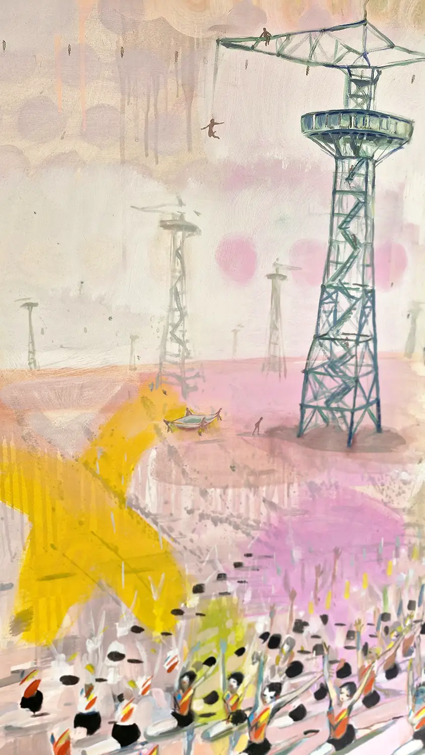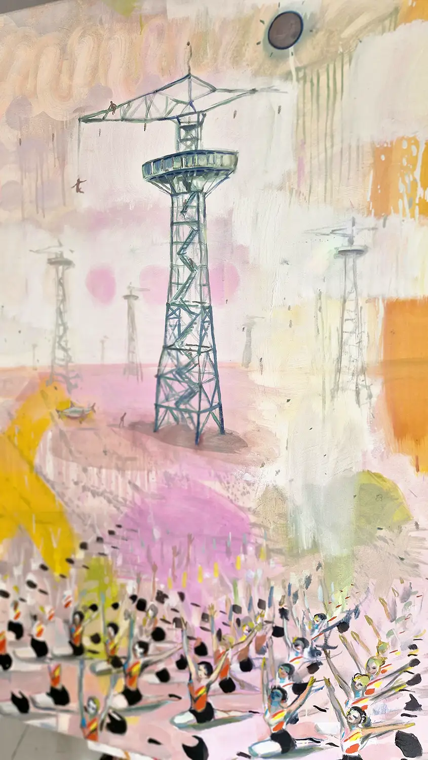 Obraz przedstawia wieżę spadochronową, na której rozgrywa się cykl skoków – od mozolnej wspinaczki po drabinach aż po moment oderwania się i lądowanie w bezpiecznej przestrzeni. To metaforyczna opowieść o wyzwaniach, które każdy z nas podejmuje w swoim życiu. O drodze, która wymaga odwagi, wysiłku i decyzji. O chwili zawahania i o momencie, w którym trzeba zaufać sobie i zrobić krok w nieznane.