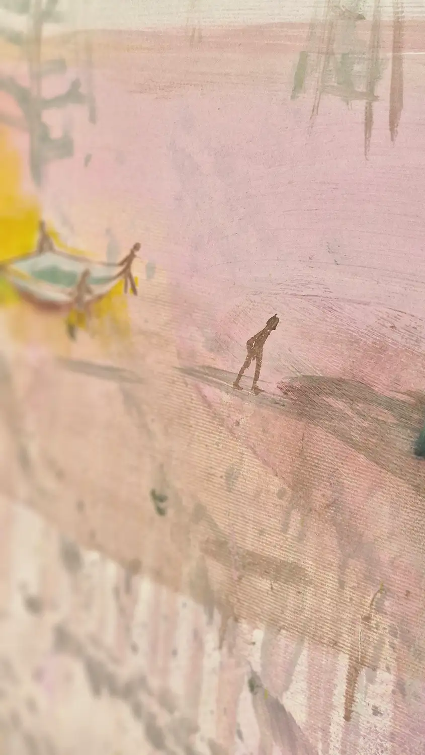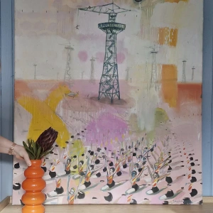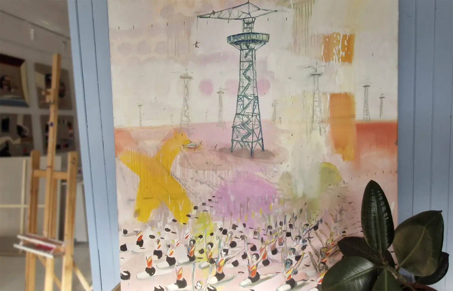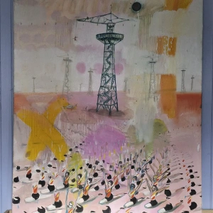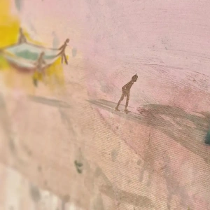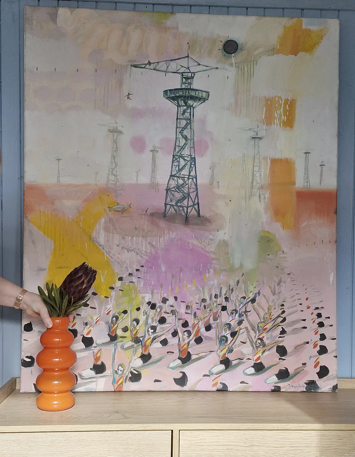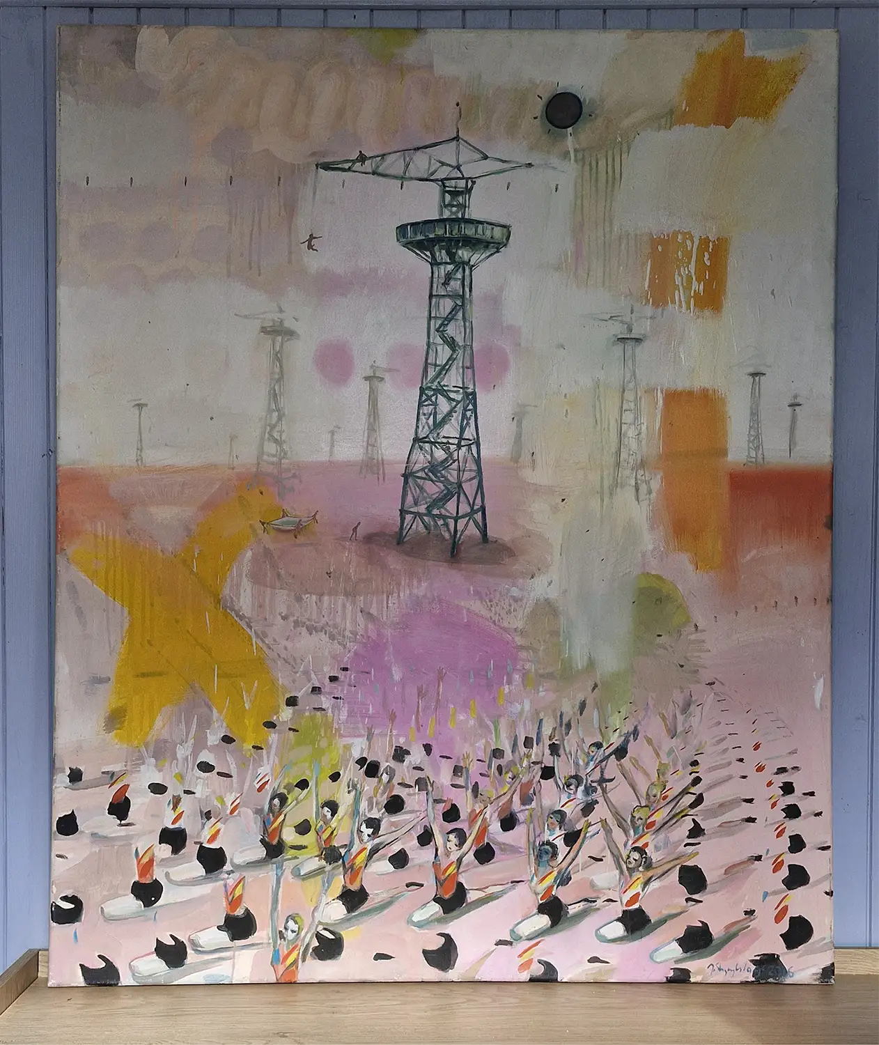 Obraz przedstawia wieżę spadochronową, na której rozgrywa się cykl skoków – od mozolnej wspinaczki po drabinach aż po moment oderwania się i lądowanie w bezpiecznej przestrzeni. To metaforyczna opowieść o wyzwaniach, które każdy z nas podejmuje w swoim życiu. O drodze, która wymaga odwagi, wysiłku i decyzji. O chwili zawahania i o momencie, w którym trzeba zaufać sobie i zrobić krok w nieznane.